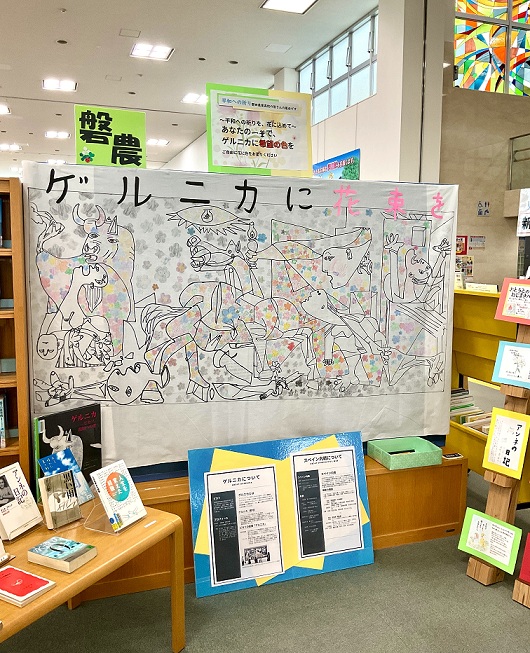 磐田農業高校の生徒の皆さんが、布に描いたゲルニカ。この絵の中の花に、色を塗り重ねることで、一つの作品になります。平和への祈りを込めて、あなたも参加してみませんか? 関連本のPOPもあわせてご覧ください。