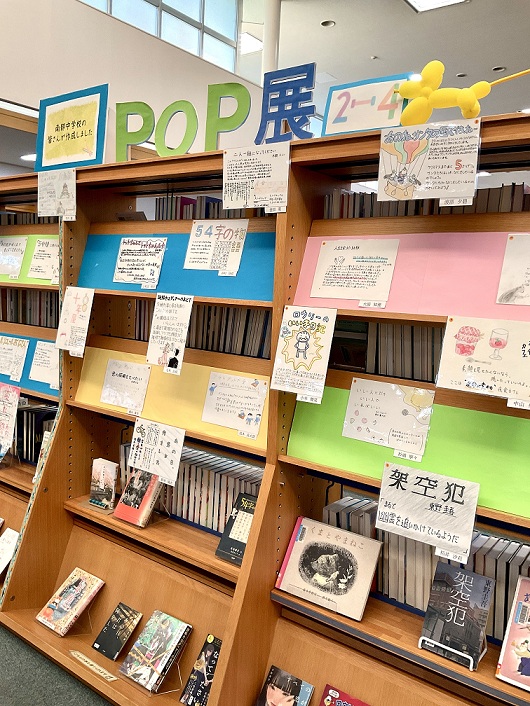 南部中学校2年4組の皆さんが作成した本のPOPを展示しています。中学生の推し本、手に取ってみませんか?