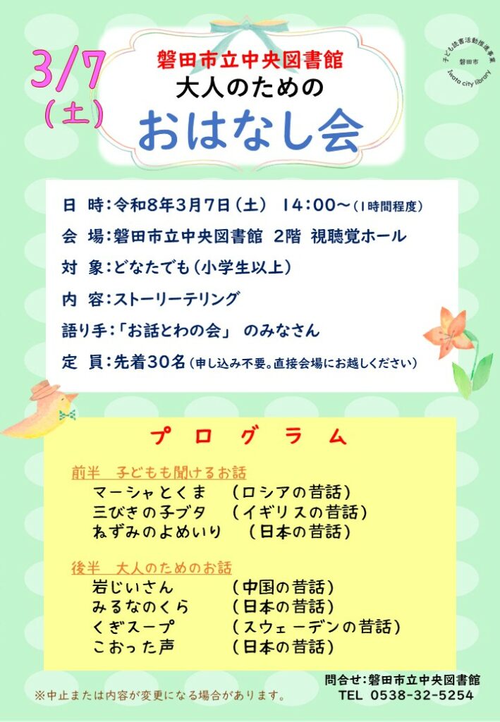 前半の部で子どもも楽しめるお話を、休憩をはさみ、後半の部で聞きごたえのあるお話を語ります。