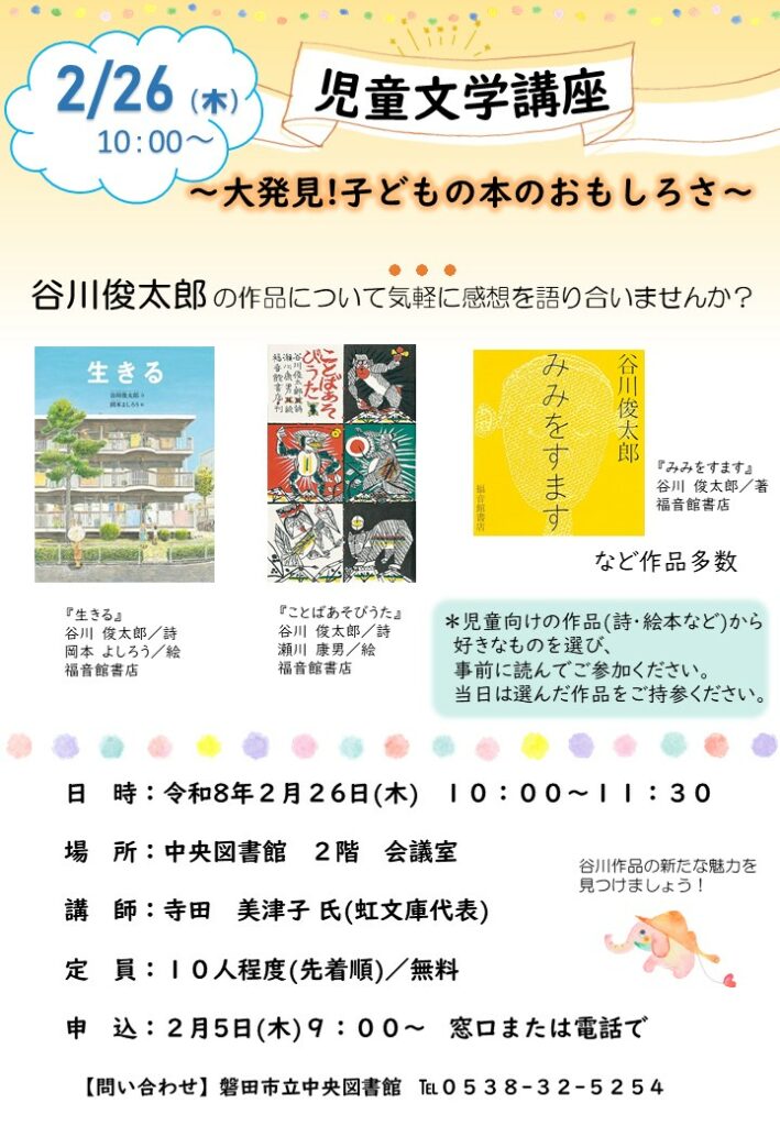 谷川俊太郎の作品について気軽に感想を語り合う、児童文学講座を開催します。